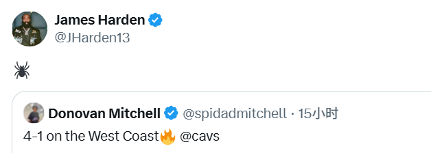 哈登在末节10分钟里得到6分4篮板4助攻。过去两场比赛,骑士第四节的进攻效率高达142.0。赛后,哈登转发了米切尔的庆祝胜利的社媒,配上了蜘蛛的表情,而那正是米切尔外号的标志。