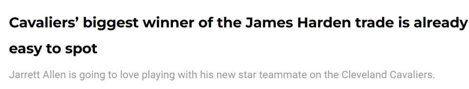 球评帕金斯也说:“当你引进了有史以来最好的进攻球员之一、联盟过去三年中最好的组织者之一哈登时,这种转变会让周围的球员变得更好。哈登提升了克利夫兰骑士队的实力,施罗德也同样如此。所以我看着这个阵容,看着米切尔,我可以说,至少你们必须进入分区决赛。”