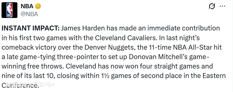 NBA官方也对哈登加盟骑士后的作用给予很高的评价。NBA官方账号写道:“即时效应: 詹姆斯-哈登在加盟克利夫兰骑士的前两场比赛就立刻做出了贡献。在昨晚逆转击败丹佛掘金的比赛中,这位11届NBA全明星命中了一记关键的扳平三分,为米切尔的绝杀罚球奠定了基础、骑士目前已经取得四连胜,近10场比赛赢下9场,与东部第二的差距仅剩1.5个胜场。”