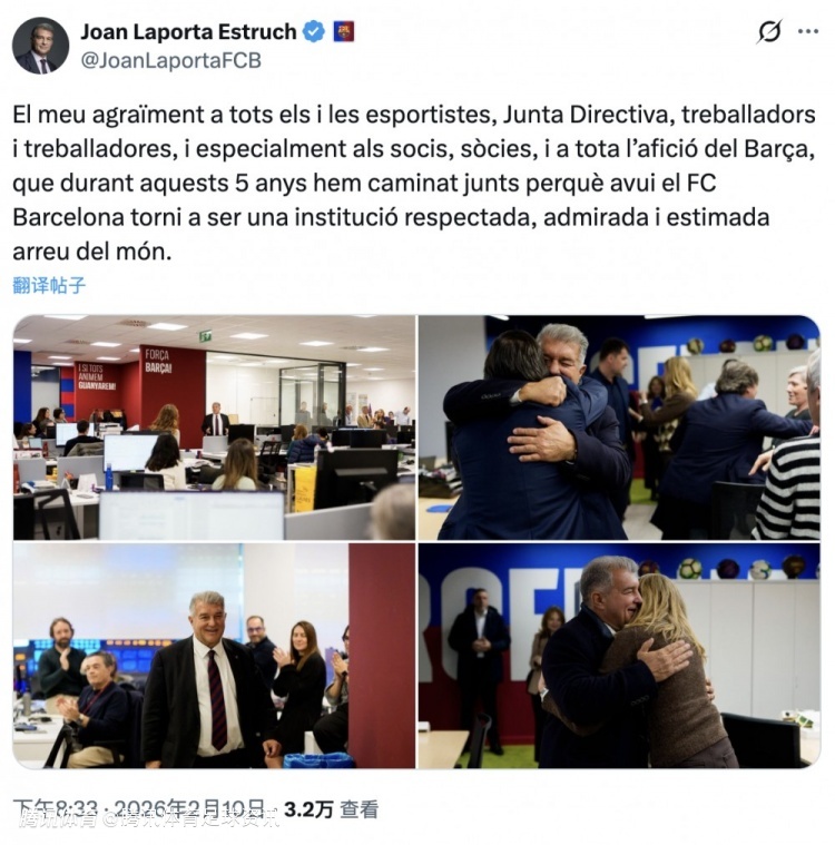 2026-02-11 07:10北京时间2月11日,拉波尔塔本周一正式辞去巴萨主席一职。周二,他在个人社交媒体发布图文,向俱乐部员工及球迷告别。