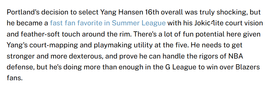 关于杨瀚森的点评,美媒写道:“开拓者在首轮第16顺位选中杨瀚森的决定当时令人大跌眼镜,但他在夏季联赛里,凭借低配版约基奇般的球场视野和篮下极其柔和的手感,迅速成为球迷宠儿。作为五号位,杨拥有出色的球场阅读能力和组织策应价值,潜力非常可观。他需要变得更强壮、动作更灵活,并证明自己能扛住NBA级别的防守强度,但他在G联赛中的表现已经足够打动开拓者球迷。”