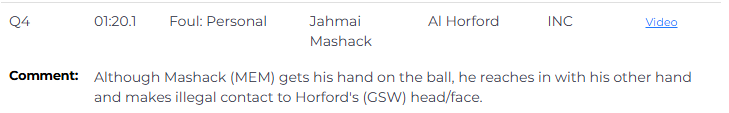 第二次漏判发生在比赛还剩1分18秒,灰熊球员马沙克虽触碰到球,但另一只手臂侵入霍福德头部/面部区域造成非法接触,此为犯规漏吹,这一次漏判是勇士吃亏。