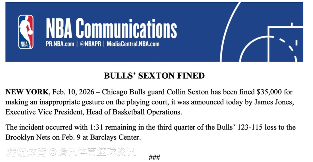 2026-02-11 10:40北京时间2月11日,NBA官方发布处罚通告,公牛后卫塞克斯顿因在比赛中做出不雅手势,被罚款35000美元。