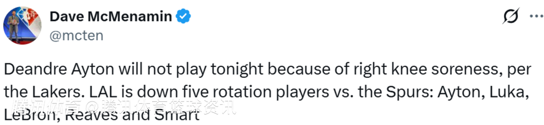 稍早前,湖人主帅透露,里夫斯因小腿拉伤复出后尚未适应背靠背比赛,所以将缺席这场和马刺的比赛,斯马特因为昨晚第四节扭伤脚踝,今晨醒来仍有疼痛感,而詹姆斯同样是因早上起来感觉小腿疼痛而缺席,东契奇虽然恢复情况良好,但今晚仍然无法出战。