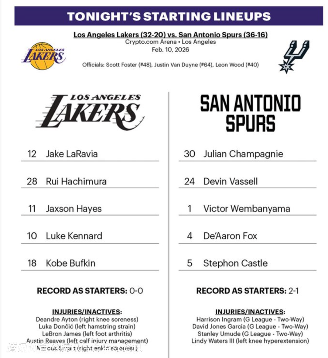 2026-02-11 11:10北京时间2月11日,今天上午11点30分,湖人主场对阵马刺,赛前双方的首发阵容出炉,湖人这边詹姆斯、东契奇、里夫斯三名进攻核心全部缺席,拉拉维亚、八村垒领衔首发阵容。