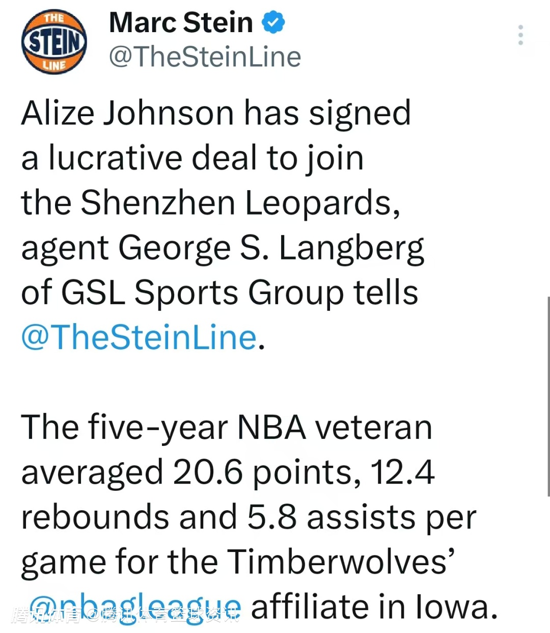 Stein:阿利兹-约翰逊加盟CBA深圳队 本赛季G联盟场均21+12