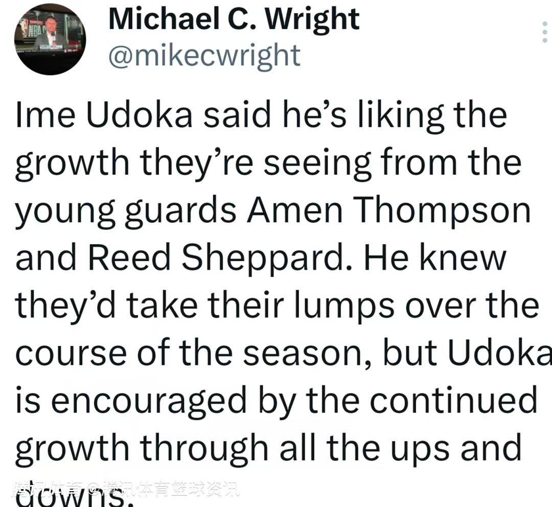 乌度卡表示,他很满意年轻后卫阿门-汤普森和谢泼德展现出的成长。他知道两人本赛季注定会经历挫折、付出代价,但乌度卡对他们在起起落落中持续进步感到备受鼓舞。
