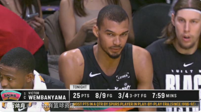 首节比赛,文班亚马首发出战7分59秒,投篮9中8,三分球4中3,拿到25分3篮板1抢断1盖帽。据统计,这是自1996-97赛季NBA逐场数据统计时代以来,马刺球员单节得分最高纪录。另外,文班这单节25分,是本赛季单节得分次高纪录,仅次于哈登对阵黄蜂的27分。