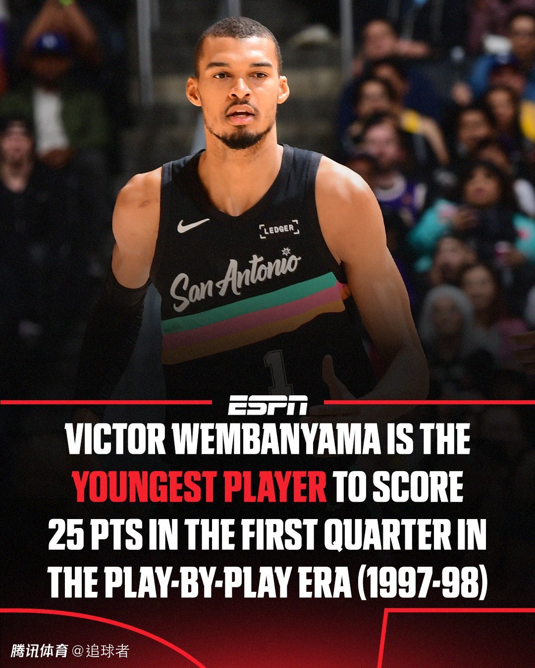 6、文班亚马(22岁38天)单节25分,有统计(1997-98赛季)以来历史最年轻达成如此成就的球员