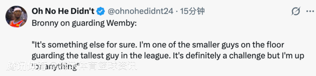 布朗尼谈到防守文班亚马时表示:“这绝对是另一种体验。我是场上身材最矮小的球员之一,却要去防守联盟里最高的球员。这无疑是个挑战,但我愿意迎接任何事。”