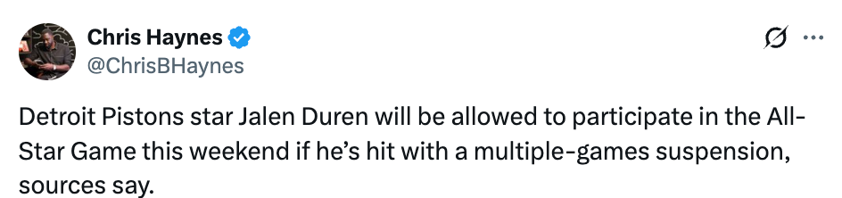 2026-02-11 23:50北京时间2月11日,据名记Haynes报道,即便底特律活塞队球星杰伦-杜伦可能会被处以多场禁赛处罚,但仍将获准参加本周末的全明星赛。
