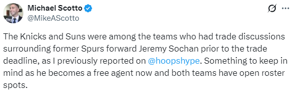 据名记Marc Stein,圣安东尼奥马刺队曾允许索汉的团队在2月6日截止日期前通过交易寻找新东家,但显然这样的交易并没有达成。