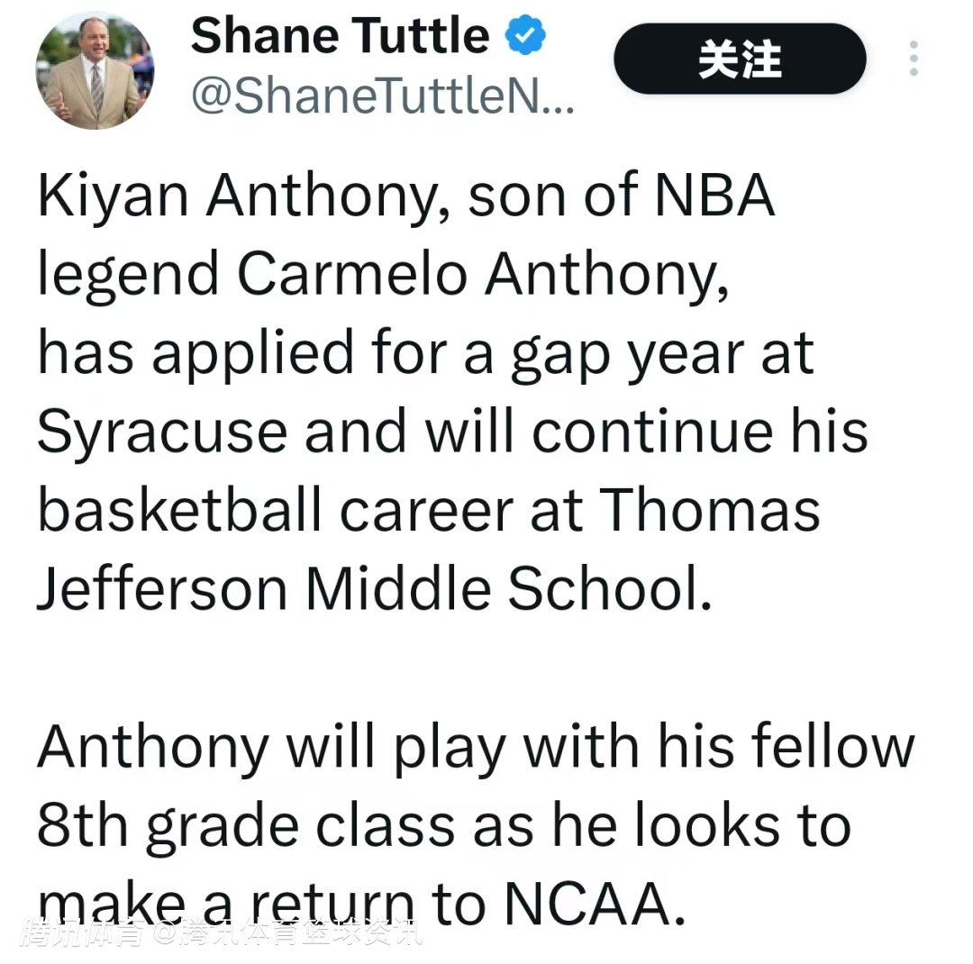 2026-02-12 08:40北京时间2月12日,据记者Shane Tuttle报道,NBA传奇球星卡梅隆-安东尼的儿子基扬-安东尼,已向雪城大学申请间隔年(休学一年),并将在托马斯-杰斐逊中学继续他的篮球生涯。
