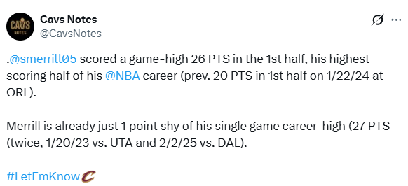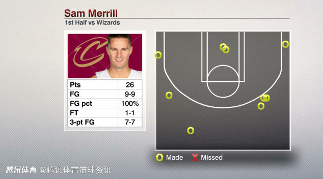 根据数据统计显示,梅里尔是NBA实时数据统计时代以来,骑士队史首位半场三分球7投全中、且总投篮命中率100%的球员。上半场26分,创造他NBA生涯上半场得分新高,同时距离他的生涯最高分(27分)仅差1分。