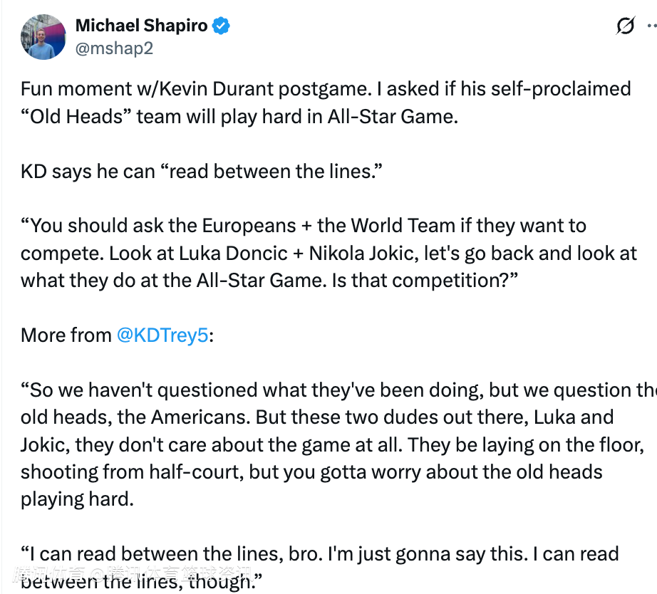 有记者提问:“你自称的‘老派球员队’在全明星赛上会不会打得很拼?”杜兰特表示:“你应该去问问欧洲球员和世界队,他们想不想真刀真枪地打。看看东契奇和约基奇,回头看看他们在全明星赛上的表现,那叫竞争吗?”