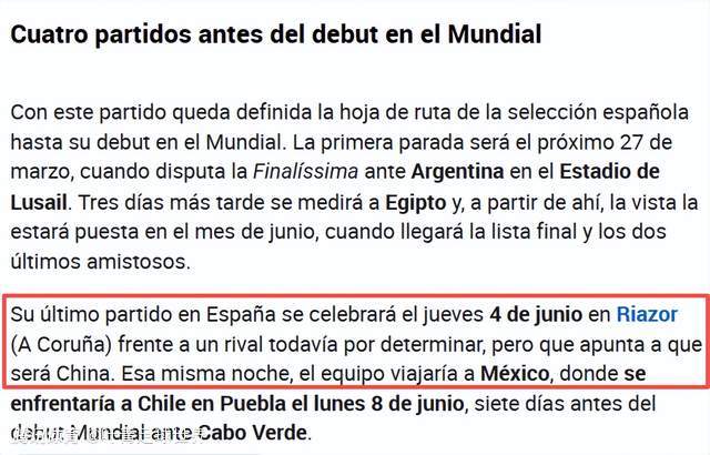《马卡报》指出,6月4日这场热身赛,西班牙的对手可能是中国男足。踢完与中国男足的热身赛之后,西班牙全队连夜飞赴墨西哥。2026年世界杯,西班牙小组赛对手之一是沙特,斗牛军团选择中国男足的原因之一,可能是将中国男足当做“假想敌”沙特。