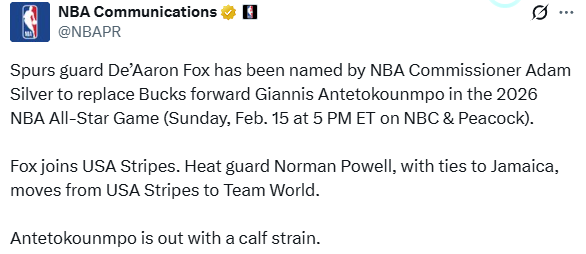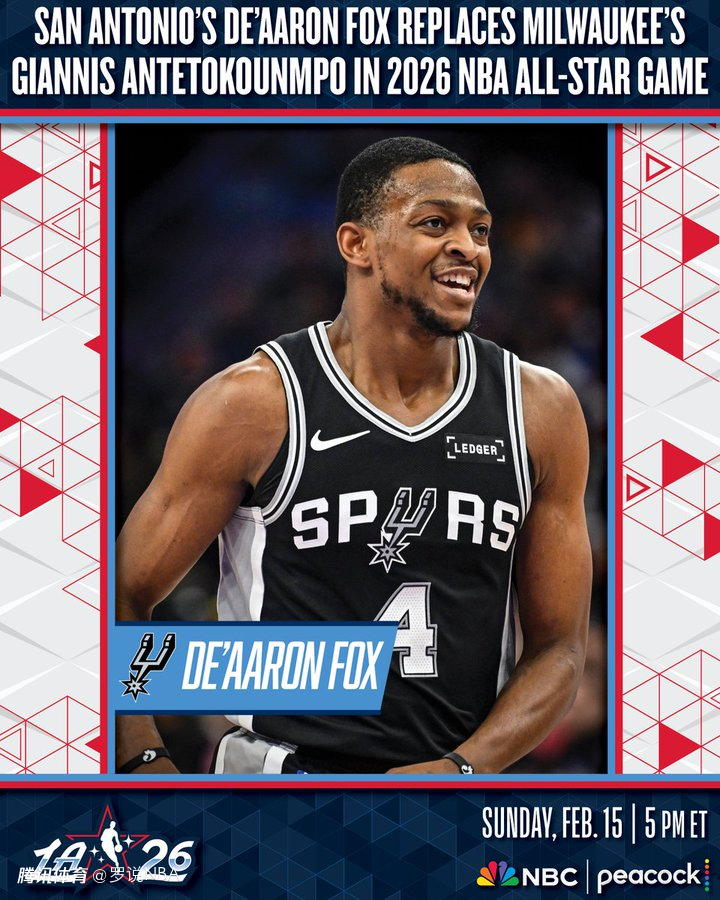 福克斯将和维克托-文班亚马一起,为目前西部第二的马刺再添一名全明星代表。条纹队将由马刺助教米奇-约翰逊执教。
