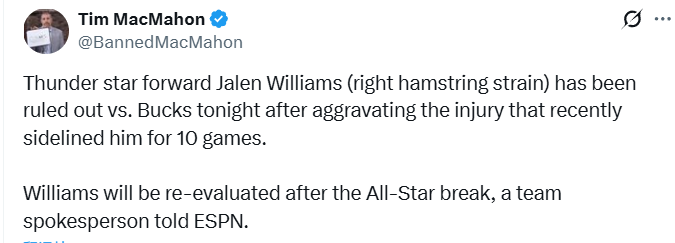 2026-02-13 05:40北京时间2月13日,据雷霆队发言人向ESPN透露,球队明星前锋杰伦-威廉姆斯不到四周内第二次右腿筋拉伤,将在全明星赛后接受复查。