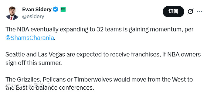 2026-02-13 06:00北京时间2月13日,据名记Shams报道,NBA最终扩军至32支球队的趋势正在增强。如果NBA老板们今年夏天批准,西雅图和拉斯维加斯有望获得特许经营权。为了平衡东西部实力,灰熊、鹈鹕和森林狼中的一队将从西部迁至东部。