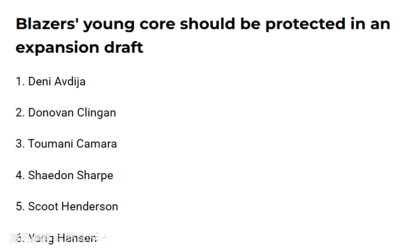 根据之前的规则,每支球队可以保护8名球员,其他球员供新军挑选组建阵容。Rip City Project指出,开拓者扩军选秀应保护的年轻核心包括6人:阿夫迪亚、克林根、卡马拉、夏普、亨德森和杨瀚森。这6人是开拓者的建队基石。其中4人是近年首轮秀,2人是交易捡漏得到的球员,共同构成了持续进步的年轻核心。