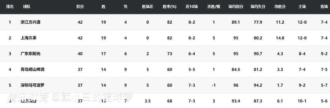 抛开俱乐部杯不算,上海男篮本赛季战绩19胜4负跟卫冕冠军广厦一样,上海男篮排在积分榜的第二位。