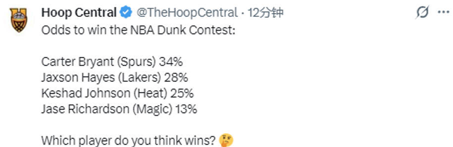 2026-02-13 11:00北京时间2月13日,Polymarket发布了全明星扣篮大赛的夺冠赔率,其中马刺队新秀卡特-布莱恩特被认为有34%的概率夺冠,排名第一,具体情况如下: