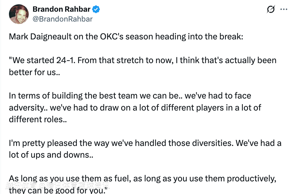 谈到雷霆全明星赛前的赛季表现,戴格诺特表示:“我们开局打出了24胜1负的战绩。从那段时间到现在,我认为这对我们来说其实是更好的历练,在打造一支尽可能强大的球队方面,我们不得不面对逆境,不得不让很多不同的球员承担起各种不同的角色,我对我们应对这些变化的方式感到非常满意。我们经历了很多起起落落,只要你把这些起伏当作动力,把它们转化为积极的力量,它们就会对你有益。”
