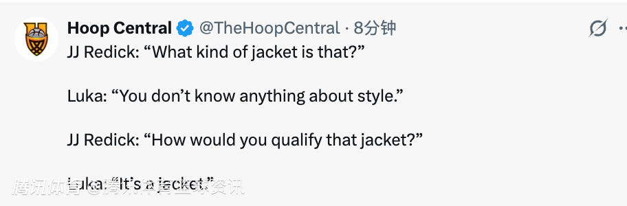 东契奇这场比赛穿着一件灰色的夹克,雷迪克看到后便问道:“这是什么款式的夹克?”东契奇则是打趣回应:“你对时尚一窍不通。”随后雷迪克又问道:“那你怎么评价这件夹克?”东契奇则是表示:“它就是件夹克。”