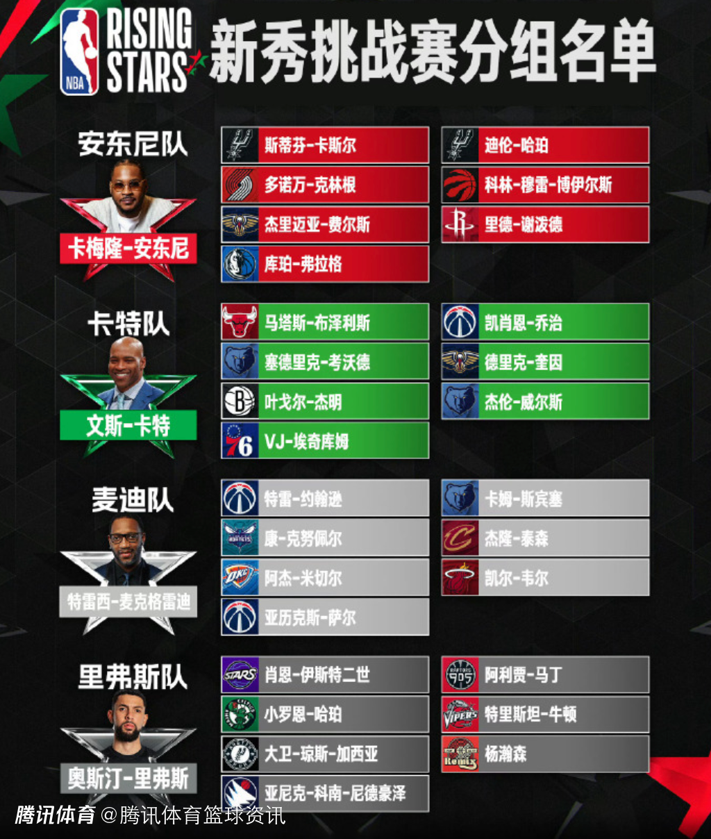 安东尼队:弗拉格(独行侠)、谢泼德(火箭)、卡斯尔(马刺)、迪伦-哈珀(马刺)、费尔斯(鹈鹕)、克林根(开拓者)、科林-默里-博伊尔斯(猛龙)