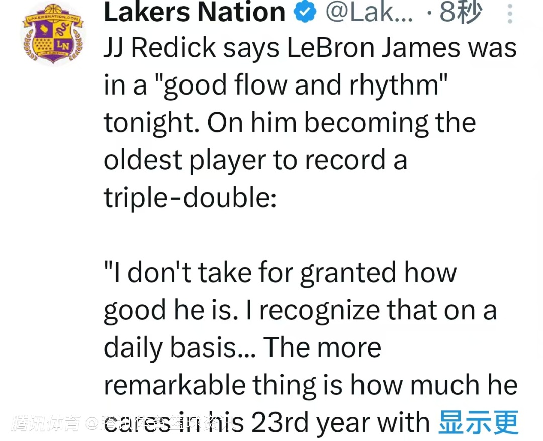 “更了不起的是——在生涯第23个赛季,在已经荣誉满身的情况下,他依然对比赛如此上心。所以真正值得惊叹的,不是他又成为了某项最年长纪录的保持者,他还会不断刷新这些纪录,还会继续巩固自己的得分历史第一纪录,这些都是迟早的事。”