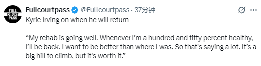 对于复出时间,欧文本人并未给出明确计划,此前在直播中他也曾表示:“我不想预测复出节点,只希望以150000%的状态回归,所以目前正稳步推进康复。”