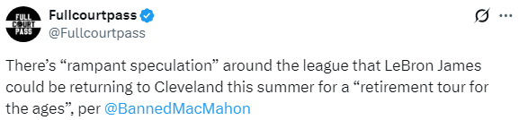 詹姆斯正在征战生涯第23个赛季,他与湖人的合同将在今夏到期,谈到詹姆斯的未来,ESPN名记Tim MacMahon表示:“听着,我不知道勒布朗自己打算做什么,我当然也不知道他要做什么,但联盟里普遍的猜测是,今年夏天将会有一次重聚,可能是一次载入史册的告别巡演,詹姆斯下赛季将再次回到家乡,回到克利夫兰骑士。”