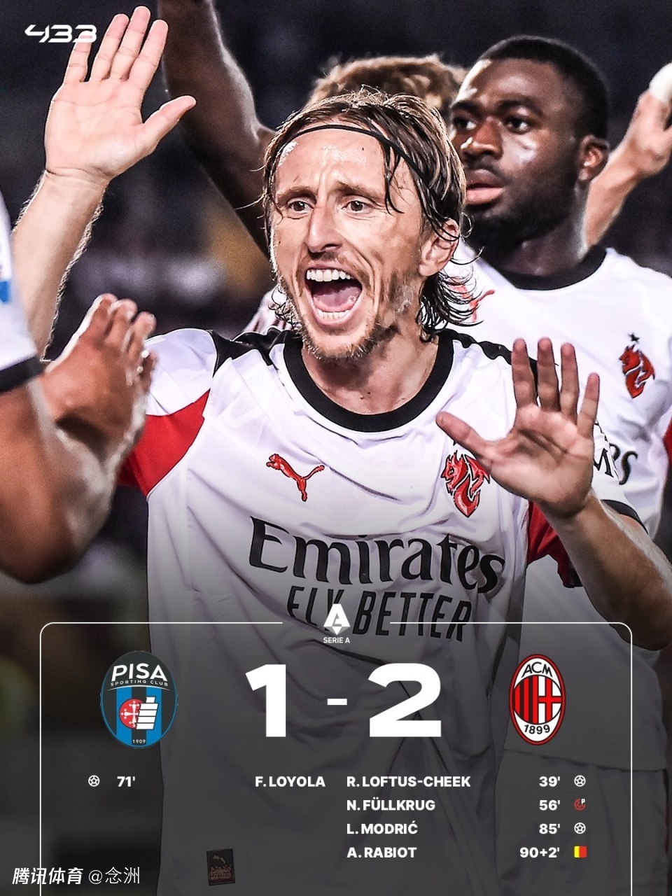 意甲第25轮,AC米兰2-1击败比萨,暂落后榜首5分。奇克破门首开纪录。拉比奥打进一球但是因菲尔克鲁格手球犯规在先被吹,菲尔克鲁格罚丢点球,洛约拉扳平,40岁的莫德里奇破门,拉比奥两黄一红被罚下。