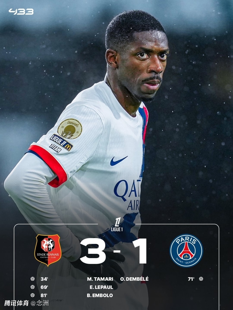 法甲第22轮,巴黎圣日耳曼客场1-3不敌雷恩,终结联赛7连胜。杜埃错失单刀良机,塔马里首开纪录,勒波尔扩大领先优势,登贝莱扳回一城,恩博洛锁定胜局。