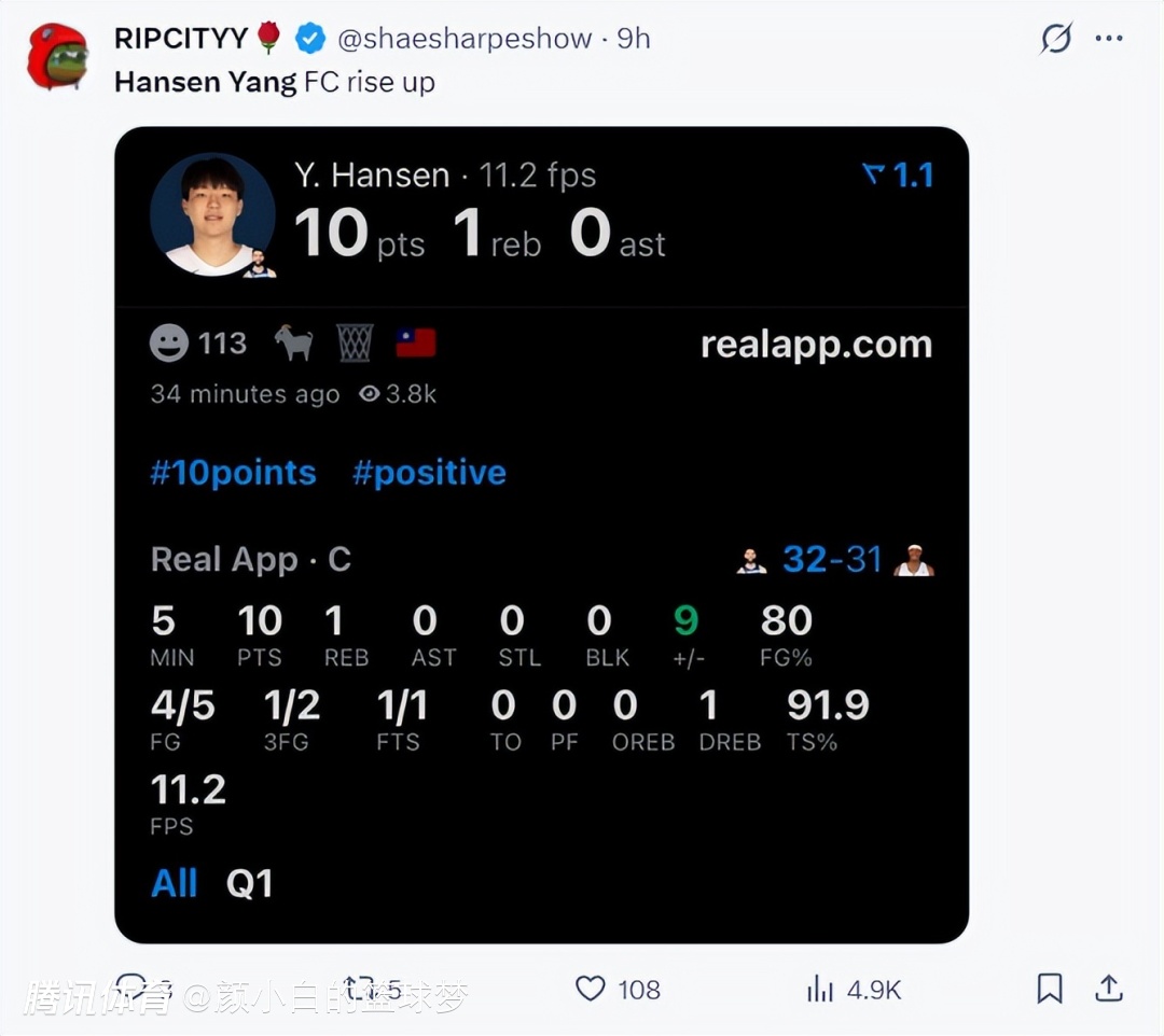 拓媒Ripcityy也发声祝贺杨瀚森在全明星赛起飞。