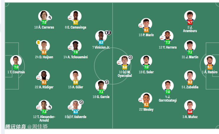 后卫:12-阿诺德(60’2-卡瓦哈尔)、22-吕迪格(60’4-阿拉巴)、24-赫伊森、18-卡雷拉斯