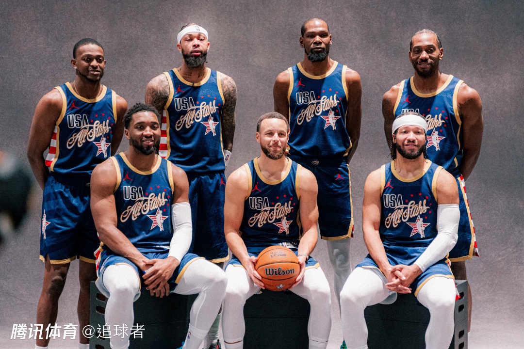 美国星条队众将合影留念,库里抱球坐在C位,詹姆斯和杰伦-布朗都缺席合影,据悉,詹姆斯明天将单独召开全明星发布会。