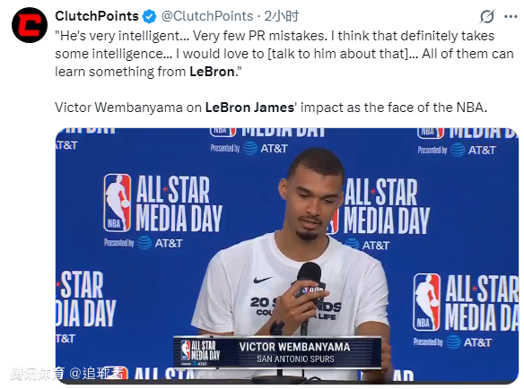 谈到詹姆斯,文班亚马表示:我真心觉得勒布朗在某些方面非常聪明,显然,他是联盟的门面,而他几乎没出过什么差错,尤其是在公关方面,这绝对需要极高的情商。