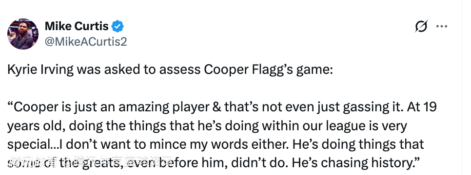 被问到如何评价弗拉格的表现时,欧文表示:“弗拉格就是一名不可思议的球员,这绝不是客套话。在19岁的年纪,就能在我们这个联盟里打出这样的表现,这非常特别。我也不想拐弯抹角。他正在做的一些事,是在他之前的一些传奇球星都未曾做到过的。他正在追逐历史。”