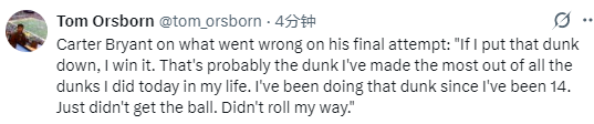 卡特-布莱恩特谈到最后一扣失败时表示:“那球扣进我就赢了。这可能是我今天所有动作里,这辈子扣成最多的一个动作,我从14岁就开始练这个扣篮。就是没接到球,运气不在我这边。”