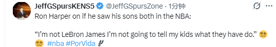 哈珀表示:“我不是勒布朗-詹姆斯,我不会去规定我的孩子们必须做什么。我很享受来看他们比赛的时光。不管怎样,享受这场比赛吧。我跟孩子们说过,只要你在NBA拥有任何机会,你就一定要抓住。”
