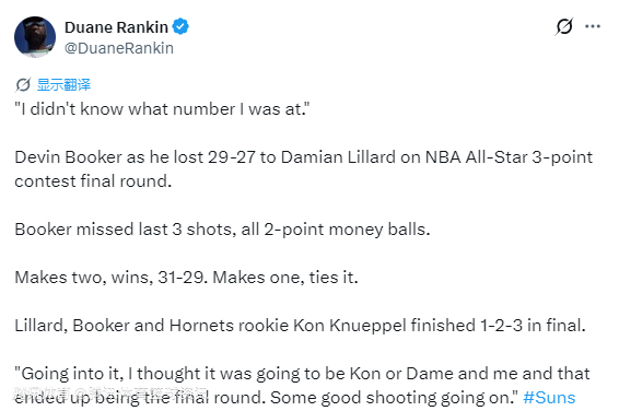 2026-02-15 10:30北京时间2月15日,在NBA全明星周末三分球大赛中,太阳球星布克以27-29不敌利拉德,无缘冠军。布克最后三投全失,且都是2分的花球。那三球里只要进两球,他就能以31-29赢下比赛;进一球则能追平。最终,利拉德、布克和黄蜂新秀克努佩尔在决赛中分获冠、亚、季军。