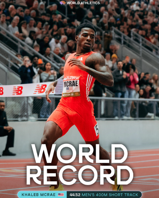 2026-02-15 11:00在2月13日进行的美国室内田径泰森邀请赛上,参加了去年东京世锦赛的美国男子400米高手卡勒布-麦克雷,在室内400米跑上,跑出44秒52的个人最佳。
