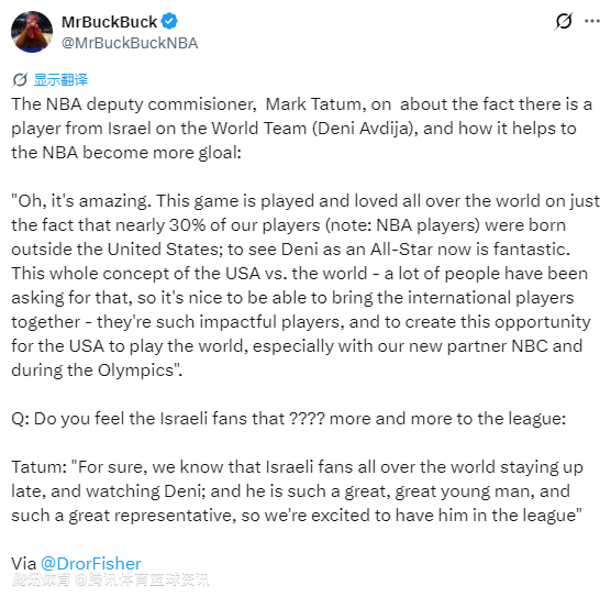 2026-02-15 19:30北京时间2月15日,NBA副总裁马克-塔图姆在接受采访时,谈及世界队中有以色列球员阿夫迪亚以及这如何推动NBA更加全球化。