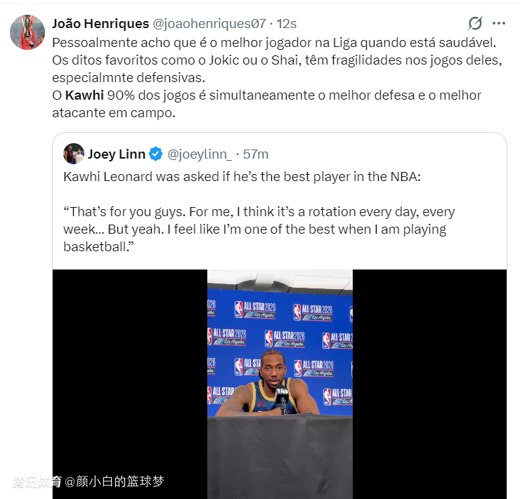 有一位欧洲记者转推后写道:我觉得小卡健康时就是联盟最出色的球员。约基奇、亚历山大这些球员都有一些弱点,特别是防守端,而卡哇伊90%的时间里是场上进攻/防守最好的那个。