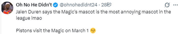 在谈到哪支球队的吉祥物最烦人时,杜伦说道:“最烦的?我第一反应就是奥兰多魔术的吉祥物,感觉他最吵。”
