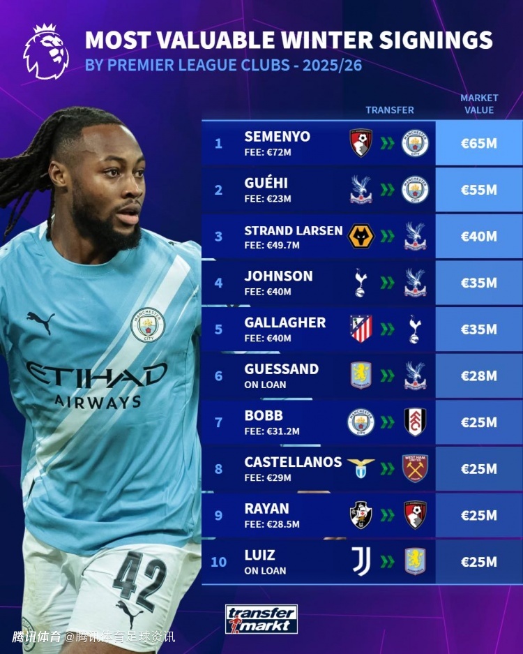 五大联赛冬窗新援身价:英超塞梅尼奥6500万居首 西甲卢克曼3500万领跑