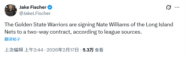 2026-02-17 04:40北京时间2月17日,据NBA名记Fischer报道,勇士将与内特-威廉姆斯签下一份双向合同。