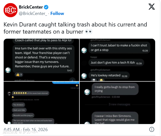 2026-02-17 05:40北京时间2月17日,杜兰特的疑似小号引起热议。在疑似杜兰特的小号上,有吐槽火箭和太阳时期队友的内容。名嘴比尔-西蒙斯直言无风不起浪。有虚假新闻账号趁机传播谣言,声称NBA会调查杜兰特的小号事件。
