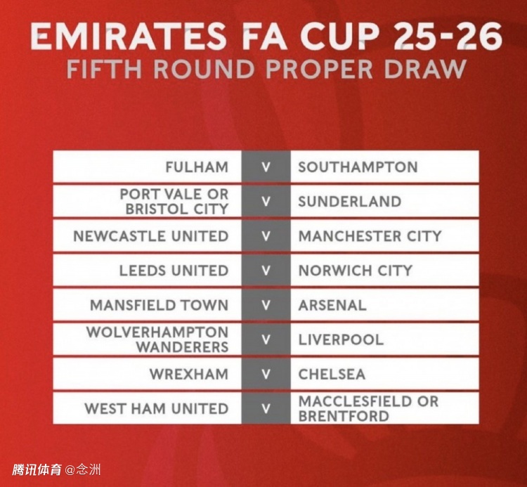 足总杯第五轮抽签仪式结束,曼城对阵纽卡斯尔,阿森纳面对低级别球队曼斯菲尔德,利物浦VS狼队,切尔西面对雷克瑟姆,富勒姆对阵南安普顿,利兹联对阵诺维奇,等等。